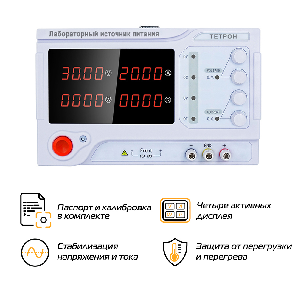 4 индикатора для отображения напряжения, тока, мощности и сопротивления |